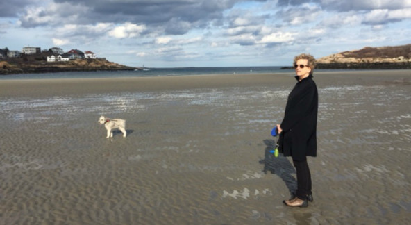 Boston journalist Anita Diamant pictured with Buddy at Good Harbor Beach in Gloucester, Mass., winter 2013. (photo by Ms Diamant)