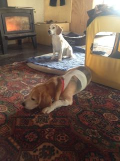 On Monday (a day after discharge), Teddy was at home resting near the log burner and constrained in either his crate or a playpen area that Jill had set up for him.  His pack mates – sister Verdi (shown in the background) and his mother, Maggie were a little confused by the new situation.  Verdi was showing some signs of dominance – growling at Teddy.